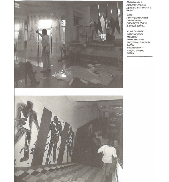 Г.: Да, к 7 июля над козырьком входа в ПРОК действительно раздулись белые паруса с синими буквами. У дверей возникли диковинные белые манекены, на месте раздевалки — пестрые картонные стулья-тумбы с картонными тумбами-столиками, вдоль лестничных маршей стремительные фигуры, взбирающиеся по стенам…