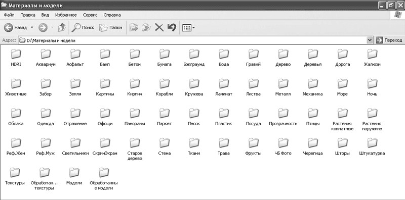 Создайте один общий каталог для хранения материалов и текстур. Например, он будет называться Материалы и модели. В этом каталоге создаются дополнительные папки, разбитые по категориям (рис. 0.1).