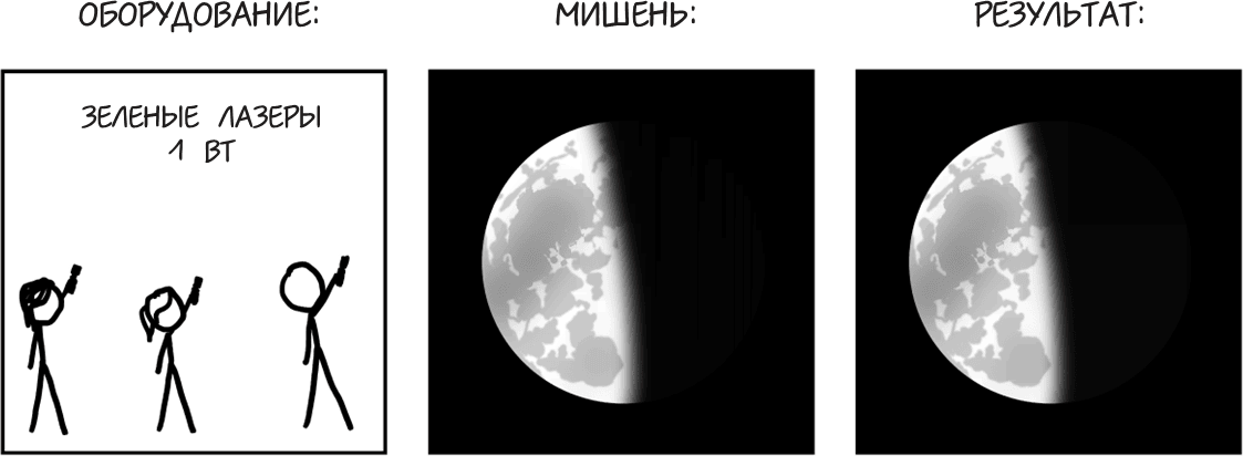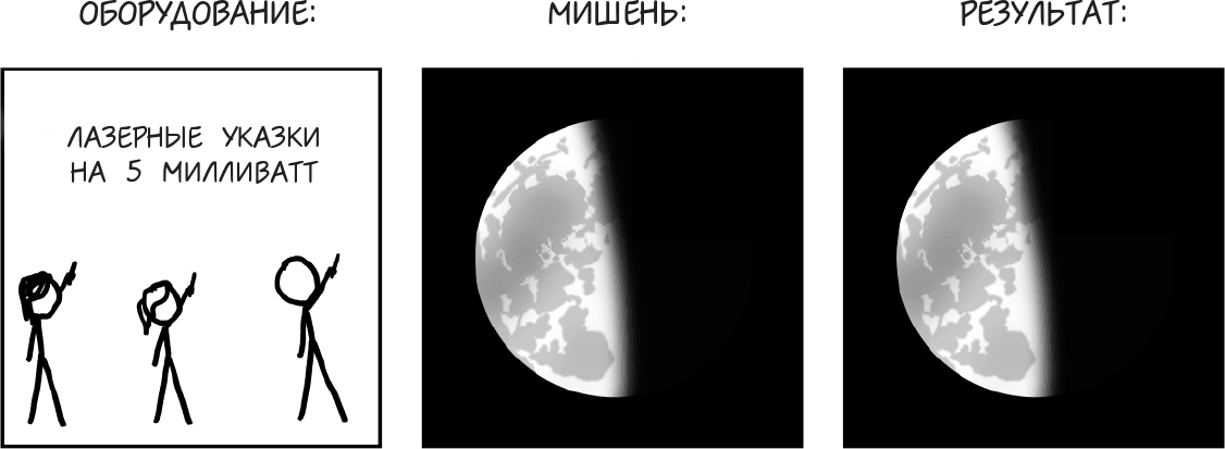 Какую луну выбрать – новую или полную? С одной стороны, луна в новолуние гораздо темнее, и свет наших лазеров было бы проще заметить. Но с другой стороны, такая луна – сложная мишень, поскольку видно ее в основном днем, а значит, результат наших усилий практически не будет виден.