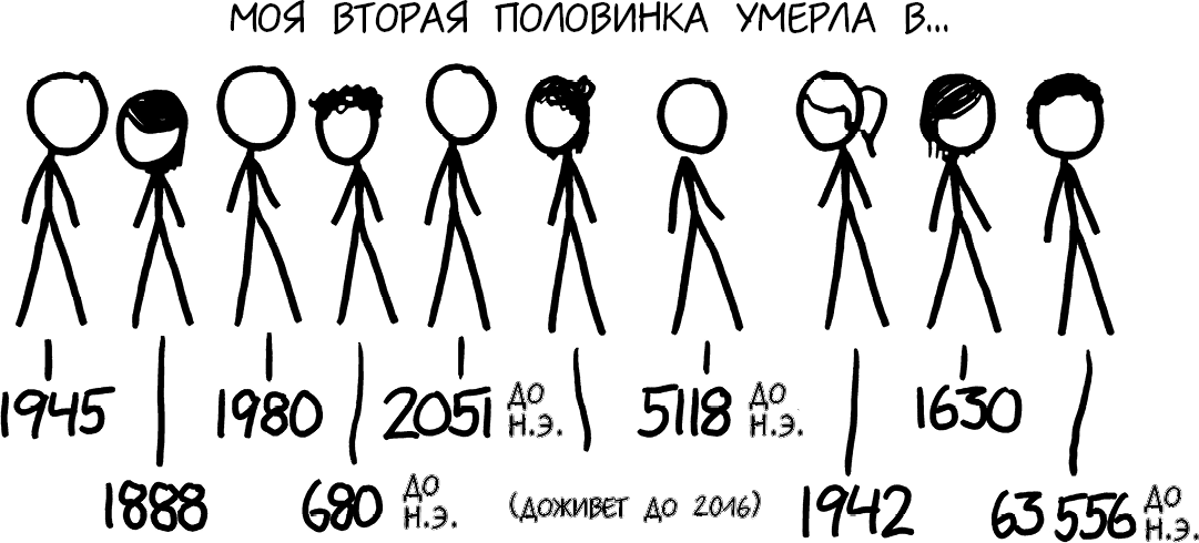 Сразу возникают некоторые вопросы. Во-первых, жива ли еще ваша вторая половинка? За всю историю человечества на Земле жило около сотни миллиардов людей, но сегодня нас только семь миллиардов (таким образом, человеческая жизнь до сих пор приводила к смерти в 93 % случаев). Иными словами, 93 % вторых половинок уже нет в живых.