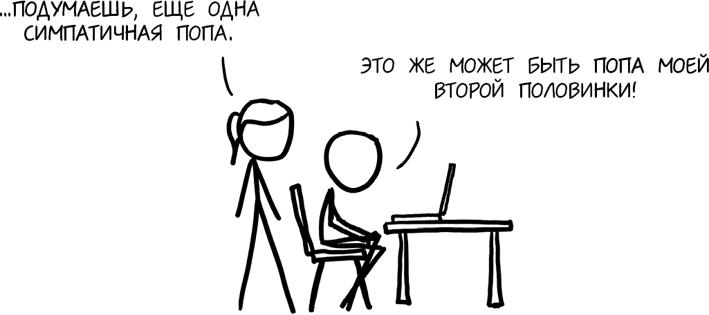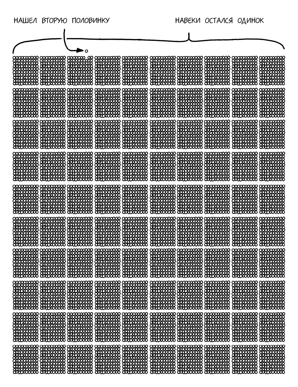 Как видим, шансы столкнуться со своей половинкой весьма малы. Количество незнакомцев, которым мы смотрим в глаза каждый день, варьируется от нуля (если вы отшельник или житель маленького городка) до нескольких тысяч (если вы полицейский на Таймс-сквер), но давайте предположим, что вы встречаетесь взглядом с несколькими десятками незнакомцев в день (я скорее интроверт, поэтому для меня это довольно щедрое предположение). Если 10 % из них примерно ваши сверстники, то всего за всю жизнь вы поймаете взгляд примерно 50 000 людей. С учетом того, что у каждого из нас есть 500 000 000 потенциальных половинок, истинную любовь в течение своей жизни обретет лишь один из 10 000…