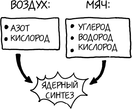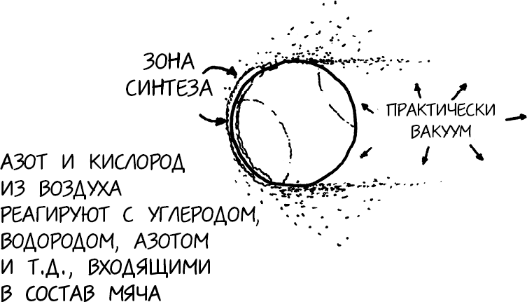 После того как я впервые опубликовал все эти расчеты, физик из Массачусетского технологического института по имени Ханс Риндеркнехт рассказал мне, что он смоделировал этот сценарий на компьютерах своей лаборатории. Выяснилось, что в начале полета мяча большая часть молекул воздуха двигалась слишком быстро, чтобы это привело к синтезу: они просто пролетали бы сквозь мяч, нагревая его более медленно и равномерно, чем описано у меня.