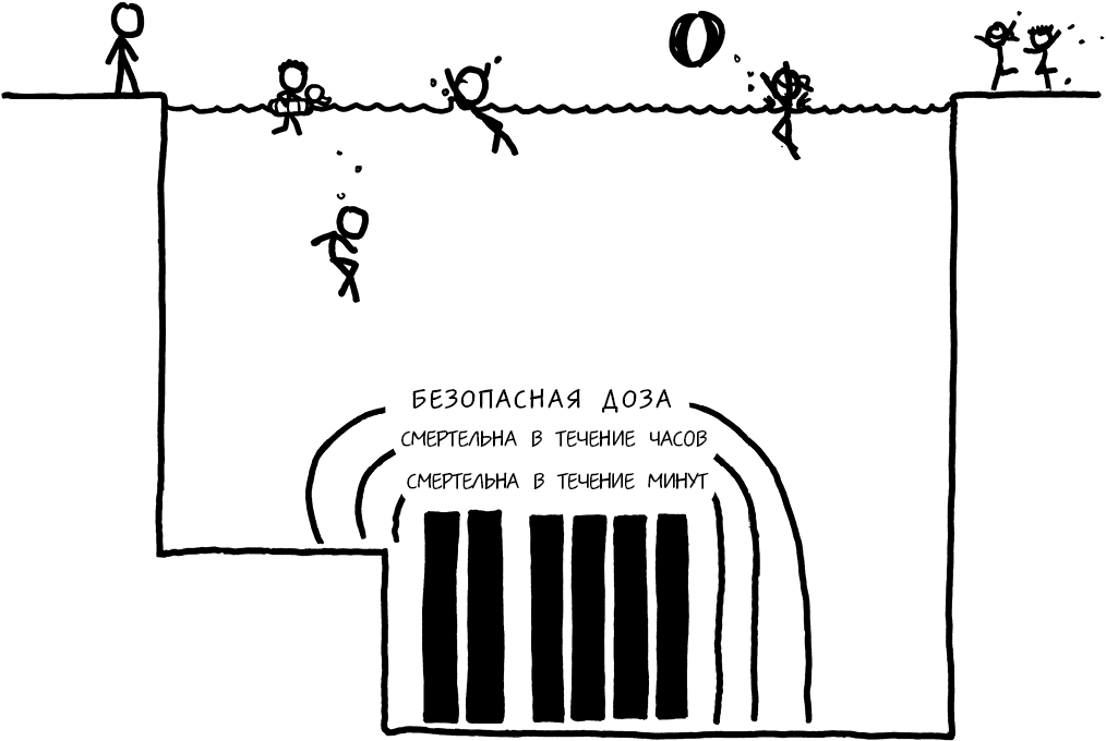 Однако за пределами опасной зоны можно плавать сколько угодно – доза излучения, которую вы получите, будет меньше, чем обычное фоновое излучение в повседневной жизни. Вода защищает вас от большей части этой фоновой дозы, так что, плавая в бассейне для отработавшего ядерного топлива, вы получите меньшую дозу радиации, чем просто прогуливаясь по улице.