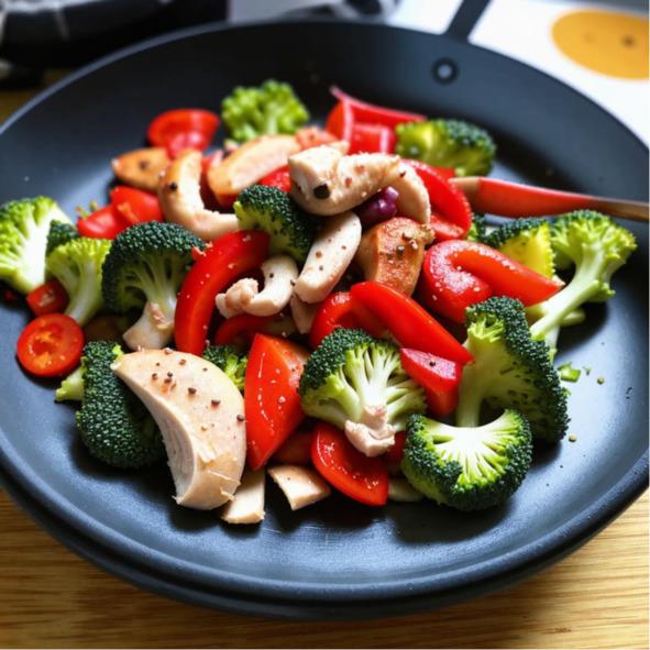 Куриное филе нарежьте и обжарьте на сковороде с оливковым маслом до золотистой корочки. Добавьте нарезанные овощи и готовьте еще 5—7 минут. Приправьте специями по вкусу.