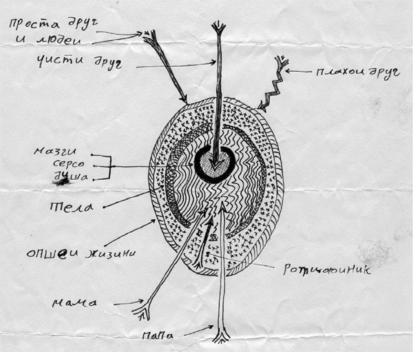Хасан, 30 лет, беженец из восточной страны, с юного возраста участвовал в военных действиях, неоднократно заключался в тюрьму, где подвергался пыткам. Оказался в России один, лишенный контактов и каких-либо сведений о семье. Вырос в благополучной семье: «В детстве я не знал огорчений, все красивыми словами разговаривали». Обратился к психологу с жалобами на нарушение сна и неконтролируемые аффективные вспышки, в ходе которых появлялось непреодолимое желание себя поранить. Увидев свою кровь, начинал плакать. Развитие приступа мог приостанавить человек, которому Хасан доверял: если он крепко его держал, то двигательное возбуждение сменялось разрядкой и плачем. На пятый сеанс Хасан принес и отдал психологу свой рисунок(рисунок 1), сопроводив его такими словами: «В метро есть карты метро, а это карта души». Хасан сказал также, что сразу понимает по глазам намерения человека. Терапия этого клиента не была длительной, поскольку вскоре он покинул Россию.