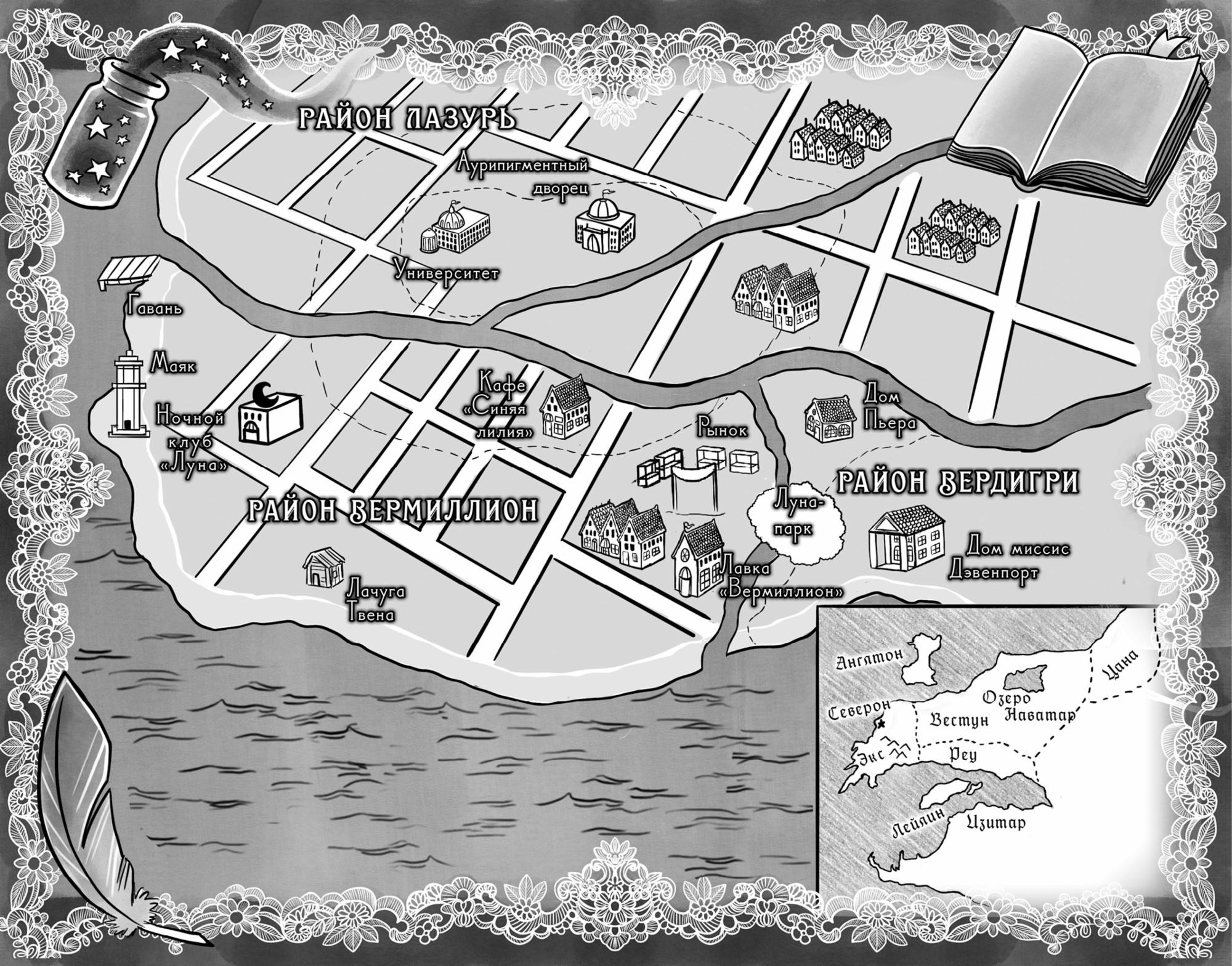 Еще выделялись ярко-красные участки района Вермиллион. Крытые дешевой глиняной черепицей, дома Вермиллиона заполняли бреши между Вердигри и Лазурью и тянулись к самым берегам Северона. Одно время велись разговоры о том, чтобы обнести Вермиллион стеной, будто стена удержала бы район от разрастания, но от планов быстро отказались: слишком многие богачи любили проскальзывать в его темные проулки, кафе, книжные, бордели и магазины.