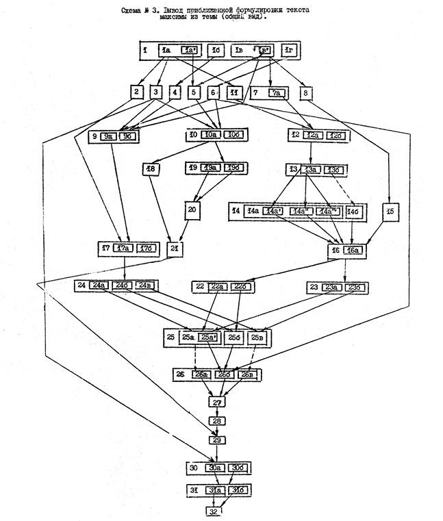 Выше я привожу уменьшенную фотографию обобщенной схемы порождения максимы, уместившейся на одном развороте препринта (С. 26–27).