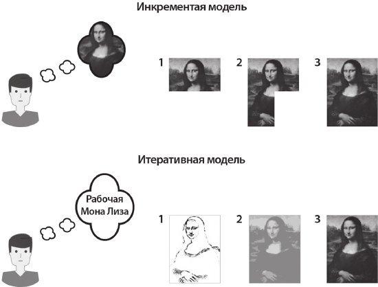 На рисунке показана итерационная «разработка» Моны Лизы. Как видно, в первой итерации есть лишь набросок Джоконды, во второй появляются цвета, в третьей добавляются детали и насыщенность, и процесс завершается. В инкрементной же модели функционал продукта наращивается по кусочкам, и продукт составляется из частей. В отличие от итерационной модели, здесь каждый кусочек – целостный элемент.