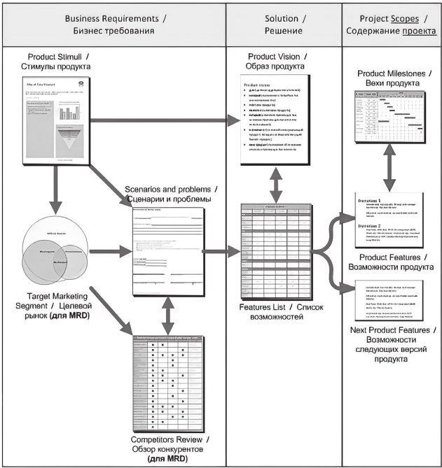 Это фазы управления развитием продукта – итерациями жизненного цикла. И в отличие от «водопада» каждая из фаз может повторяться по несколько раз, отражая изменение требований заказчика продукта.