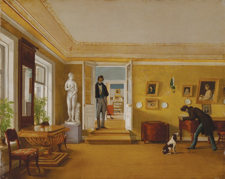На первой картине мы видим анфиладу комнат большой квартиры — или даже усадьбы — первой трети XIX века. Собственно, комнат четыре; череда дверных проемов — все более узких и низких, как учит перспектива, — ведет наш взгляд сквозь, пока он не упирается в стену последнего из помещений. Впрочем, это не настоящая стена, а тоже дверь, но закрытая, причем перманентно, она превращена в своего рода украшение, в часть дизайна последней комнаты анфилады, к ней приставлена этажерка, населенная, насколько это возможно разглядеть в глубине картины, мелкими гипсовыми слепками классицистической скульптуры. На само́й двери, похожей на алтарь, висят четыре картины, образуя крест, осеняющий этажерку, которая составляет как бы основание этого креста. Картины по бокам и сверху разглядеть сложно, в центре же — портрет мужчины. В предпоследней комнате у двери стоит коричневый комод, а во второй от нас комнате, буквально на пороге первой, отчасти загораживая перспективу, дверной косяк подпирает молодой человек в светло-серых панталонах, черном фраке с белым жилетом, черном же шейном платке и черных штиблетах. Прическа его, по моде конца 1820-х годов, с начесанным чубом. В руках молодой человек держит невероятно длинную курительную трубку, чашей вниз. Он скучает, его поза хорошо это передает.