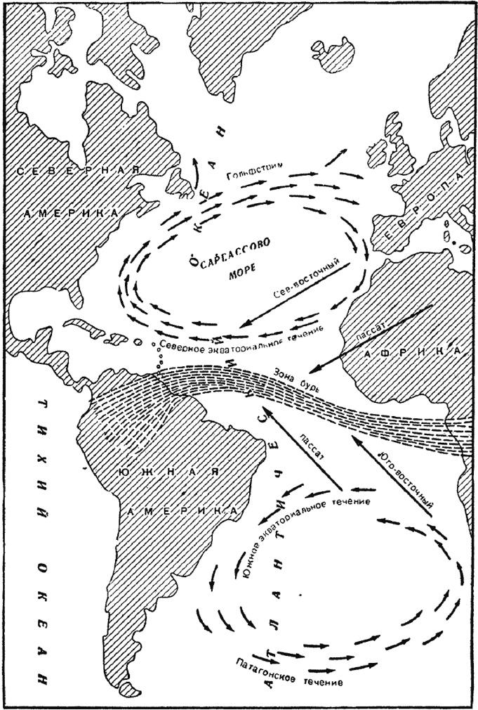 И вот я погрузился в изучение так называемых «исключительных» плаваний, главным образом одиночных. Я не буду останавливаться на истории одиночных морских путешествий, достаточно подробно описанных моим другом Жаном Меррьеном [15]. Скажу только, что изучение этих плаваний показало мне с достаточной ясностью, что для того, чтобы привлечь к нашей экспедиции внимание, нужно пересечь океан, что для этого лучше всего избрать Атлантический океан, который позволит нам пробыть вдали от берегов столько времени, сколько нужно; и что для того, чтобы наверняка доплыть до какой-нибудь земли приблизительно за два месяца, не встречая соблазнов на каждом шагу, нужно идти дорогой пассатов, иными словами, совершить еще раз второе и четвертое путешествия Христофора Колумба: Испания — Канарские острова — мимо Островов Зеленого Мыса к Антильским островам. Так мы оставляли в стороне главные морские пути: тот, который ведет к Северной Америке и Антильским островам, пролегает севернее, а тот, что ведет к Южной Америке, проходил южнее. Одновременно мы оставляли в стороне Саргассово море и зону бурь, где мы затерялись бы, не принеся никому никакой пользы.