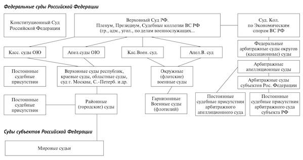 Судебная система — это совокупность судов, построенных в соответствии с их компетенцией, поставленными перед ними задачами и стоящими перед ними целями. Судебная система РФ устанавливается Конституцией РФ, Федеральным конституционным законом «О судебной системе Российской Федерации» от 23 октября 1996 г. № 1-ФКЗ; Федеральным конституционным законом «О Верховном Суде РФ»; «О судах общей юрисдикции в Российской Федерации» от 7 февраля 2011 г. № 1-ФКЗ; Федеральным конституционным законом «Об арбитражных судах в Российской Федерации» от 12 апреля 1995 г. № 1-ФКЗ; Федеральным конституционным законом «О военных судах» от 23 июня 1999 г. № 1-ФКЗ; Федеральным законом «О мировых судьях в Российской Федерации» от 17 декабря 1998 г. № 188-ФЗ.