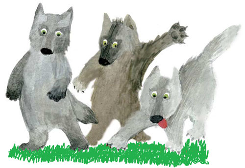 Тем же утром Затейник предложил своим братьям — Умнику и Хитруше, поиграть в пятнашки. В веселой беготне друг за другом, волчата выскакивают на берег лесного озера. А здесь! Здесь перед ними открывается потрясающая картина! Два рыбака сосредоточенно следят за поплавками, а рядом с каждым из них стоит ведро, наполненное до верха трепещущейся рыбой! Затейник и Хитруша переглядываются и, мгновенно поняв друг друга, стрелой бросаются к ведрам с намерением ухватить, хотя б по паре рыбешек. Но не тут-то было! Оба рыболова, словно почуяв готовящийся разбой, оглядываются. Понимая, что здоровенные дяденьки сейчас же кинутся отбирать свое добро, а им, воришкам, явно не поздоровится, Затейник и Хитруша с оскорбительными криками «жадины-говядины!» пускаются наутек в чащу. За ними следует и Умник. Через минуту все трое уже в безопасном месте — на своей любимой поляне. Они дружно валятся на траву, тяжело дыша и не в состоянии вымолвить ни словечка. О поляне нужно сказать, что она раскинулась на лесной опушке, по краю которой, выбежав из леса, вьется тропинка. А ведет тропинка к домику Красной Шапочки. Домик — прехорошенький, окружен с трех сторон кустами махровой сирени и хорошо виден с поляны. К моменту, когда мама Красной Шапочки начинает вынимать из духовки пышущие пирожки, волчата, уже отдышавшись, могут говорить. Первым молчание нарушает Затейник.