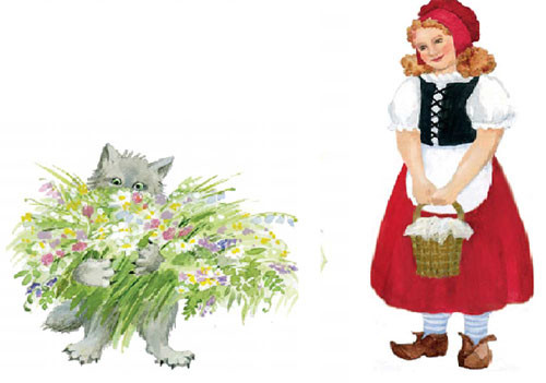 А по лесной дорожке, напевая, идет Красная Шапочка. Девочка не спешит и то и дело останавливается. Вот она слушает песенку лесной пичужки. Вот — интересуется, куда это так торопиться ежик? А вот — рассматривает изумительной красоты бабочку, присевшую на листочке кустика. Наконец, собравшись идти дальше, Красная Шапочка вдруг видит, как некто, закрывшись букетом цветов, преграждает ей дорогу!