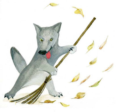 Бабушка заходит в домик. Волчата берут метлы и принимаются трудиться.