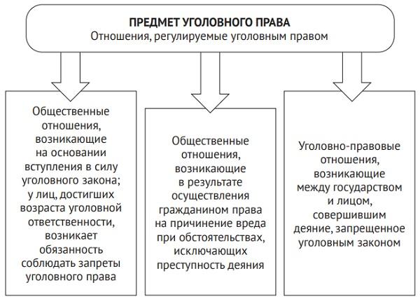Предмет уголовного права. Под предметом отрасли права обычно понимается круг тех общественных отношений, которые регулируются ее нормами. Предмет уголовного права включает в себя несколько групп правоотношений.