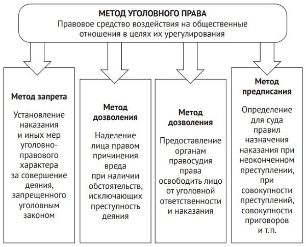 Метод уголовно-правового регулирования. Имея собственный предмет, уголовное право использует и собственный набор методов правового регулирования. Под методом в уголовном праве, как и в теории права, понимаются способы, с помощью которых уголовно-правовые нормы регулируют общественные отношения.
