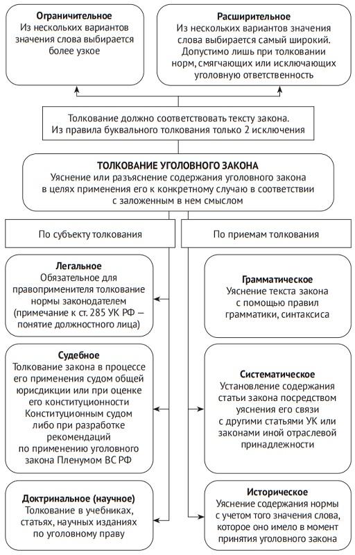 Грамматическое (филологическое) толкование закона заключается в уяснении смыла нормы, основываясь на правилах грамматики и синтаксиса, с учетом этимологии слова. При этом толкованию подлежат как отдельные слова и термины, использованные в тексте, так и предложения, а также текст статьи в целом. Учитывая, что в диспозиции статьи содержится не просто набор слов, а связный текст, значение и смысл отдельных терминов, слов, понятий, употребляемых в законе, толкуется в их системном единстве. При этом содержание обычного слова необходимо понимать в контексте, а значение термина остается постоянным и не меняется при перемещении его из текста одной статьи в другую. Например, словосочетание «должностное лицо» во всех статьях гл. 30 УК толкуется одинаково, исходя из его определения, которое дано в примечании к ст. 285 УК. Если уголовный закон заимствует термин из другой отрасли законодательства, по общему правилу, он должен толковаться с учетом этого отраслевого значения. Например, термин «налог» в ст. 198 УК толкуется в точном соответствии с тем определением, которое дано в ст. 8 Налогового кодекса РФ. В отдельных случаях из этого правила бывают исключения.