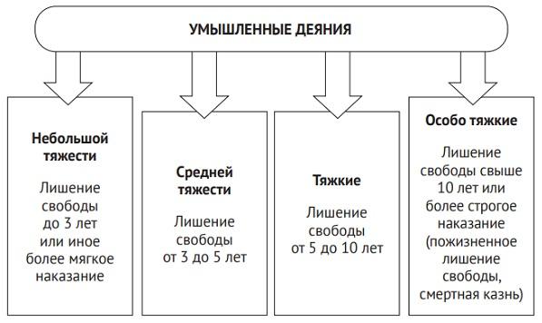 Уголовный кодекс РФ закрепил деление всех преступлений на несколько категорий, объединив в каждой из них деяния, схожие по характеру и степени общественной опасности. В основу категоризации преступлений положены: форма вины — умышленная или неосторожная; максимальные размеры самого строгого наказания — лишения свободы, которое предусмотрено в санкции статьи Особенной части УК. В результате выделены четыре категории преступлений: небольшой тяжести, средней тяжести, тяжкие и особо тяжкие (ч. 1 ст. 15 УК). Неосторожные преступления составляют только три категории: небольшой, средней тяжести и тяжкие. Для умышленных преступлений установлена и особо тяжкая категория.