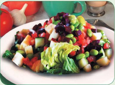 Огурцы, картофель, свеклу, помидоры, фасоль, яблоко и пекинскую капусту посолить, поперчить, заправить оливковым маслом и перемешать.