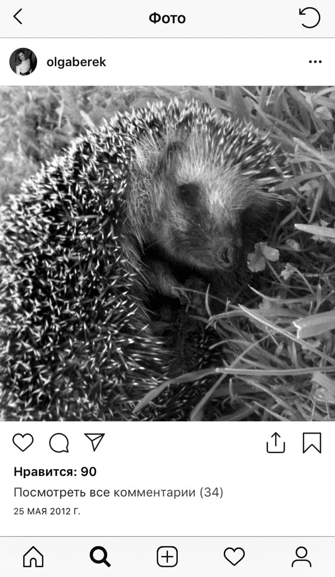 С чего я начинала? У меня был обычный личный аккаунт, без целей и грандиозных планов. 25 мая 2012 года я опубликовала в нем первый пост[10] – вот это фото ежика без текста.