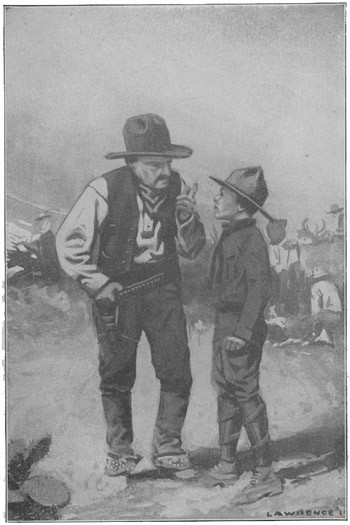 “Oh! you think so, do you, Jack?” he remarked with lofty scorn, “just wait till you glimpse my awful dad, and then you can talk. He’s a holy terror! Why, even the yellow curs in the town streets take to running with their tails between their hind legs when they see him coming along. His looks and his fog-horn voice have carried him through many a tight place; but there’s one hole he always sticks in. My dad is as good as a whole regiment, to make men shake in their boots; but—” and again did the kid puncher pause in that strange way, while a mysterious smile crept over his dark face, as though certain recollections gave him more or less amusement.