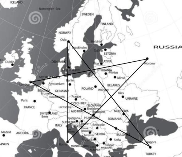 Та была весьма странной. Из пяти столиц — а конкретно, Осло, Рима, Лондона, Анкары и Москвы — были проведены линии так, что образовывали подобие пентаграммы.
