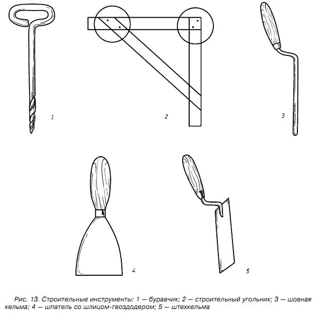 Для строительства стен из кирпича потребуются специальные инструменты. Это кельма (или мастерок) – лопатка, сделанная в форме треугольника, оснащенная короткой ручкой, растворная лопата (вместо нее можно использовать обыкновенную совковую лопату), расшивки для обработки швов в кладке, а также молоток-кирочка для раскалывания и отесывания кирпича (рис. 23).