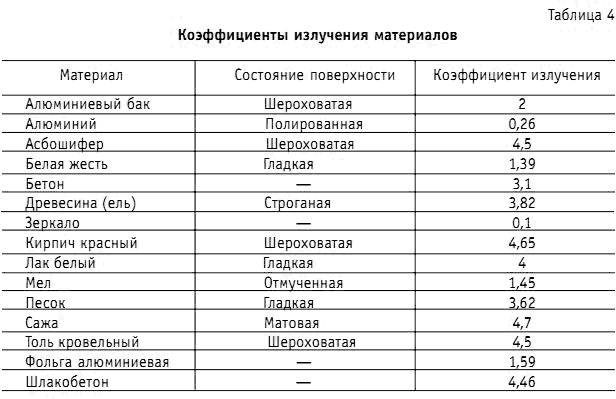 В таблице 4 указаны коэффициенты излучения некоторых материалов.