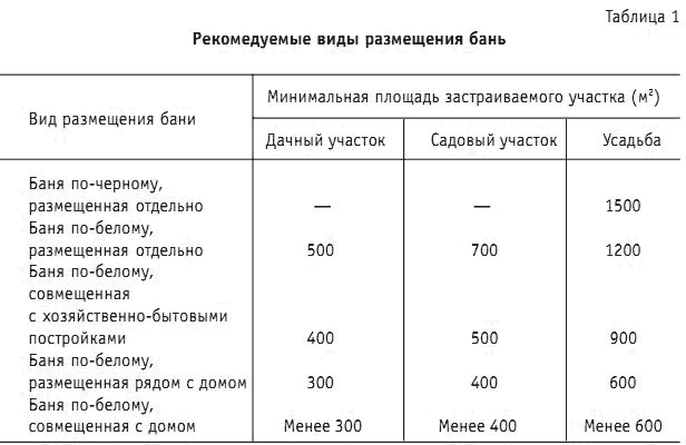 Перед началом строительства нужно тщательно продумать устройство и расположение бани. Следует отметить, что нормы на установку недымных бань отсутствуют. Исходя из размеров участка, отводимого под застройку, можно привести некоторые ориентировочные рекомендации по расположению банной конструкции (табл. 1).
