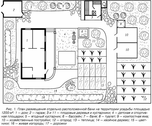На данном плане баня расположена около северо-западной границы, примерно в 10–12 м от дома, причем вход в баню находится с юго-западной стороны, то есть за ним удобно наблюдать из окна дома, когда топится печь. К тому же вход, расположенный таким образом, будет защищен деревьями и от ветра, и от чужих глаз. Окна моечной и предбанника находятся на северозападной стороне, в результате чего банное помещение будет хорошо освещаться заходящим солнцем, а во время купания можно присматривать за домом и детьми, находящимися на игровой площадке.
