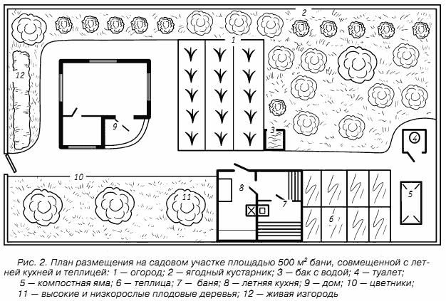 Неподалеку от бани расположен бассейн, в котором в теплое время года можно купать детей. Водой после купания можно поливать огород и деревья, которые также находятся рядом. Со стороны жилого дома крыша банного строения выступает на 1,5 м и таким образом образует навес над столом-верстаком. Пространство, находящееся под верстаком, можно использовать для хранения дров. Печь в бане отапливается из предбанника. Туалет находится сразу за баней. Такую баню можно топить круглый год. В связи с этим ее отдельное размещение и большие размеры весьма оправданы. На рисунке 2 представлен план размещения бани, совмещенной с кухней и теплицей, на участке площадью 500 м2.