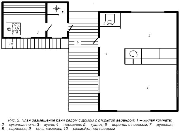 На рисунке 3 представлен план установки бани неподалеку от садового или дачного домика, в котором оборудована веранда с навесом.