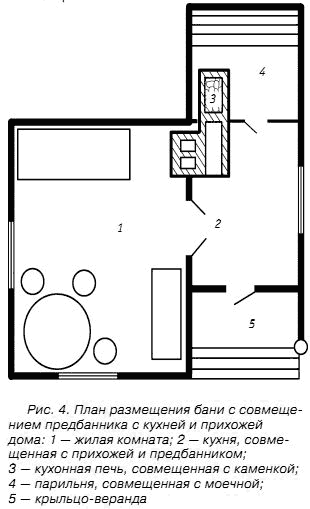 Баня, показанная на рисунке 4, является фактическим продолжением кухни – эти два помещения имеют общую печь и канализационную систему. Подобную баню можно использовать в любой момент. Печка в этом случае по своему устройству будет достаточно сложной, чтобы иметь возможность отдельного использования каменки и секции для обогрева дома.