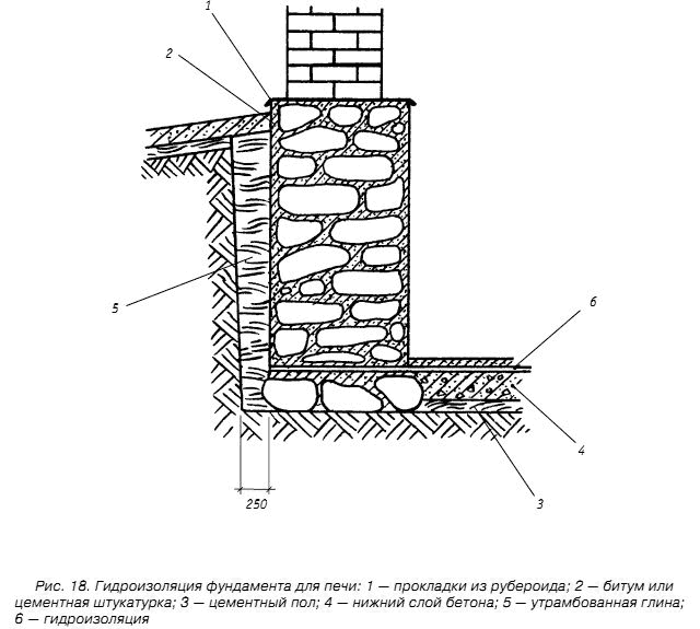 На верхнюю площадку фундамента нужно нанести слой раствора тщательно выровнять с помощью правила и уровня. Затем кладется гидроизоляционный слой, который нужно изготовить из двух слоев рубероида или какого-нибудь другого похожего строительного материала, обладающего схожими гидроизолирующими характеристиками. Если вы решили использовать рубероид, то его придется хорошенько промазать горячим битумом. Необходимо также отметить и то, что фундамент печи должен принимать на себя лишь нагрузку от веса самой печи. На него ни в коем случае не должны опираться элементы строения.