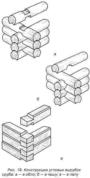 Если сруб построен из бревен, их концы обязательно будут выходить за пределы наружных стен. Такие конструкции бывают двух видов и называются «в чашу» и «в обло». Данная технология позволит обеспечить достаточно высокую прочность сруба и хорошую защиту углов от дождя и ветра (рис. 19). Чтобы несколько сэкономить материал, можно пользоваться технологией «в лапу». Тогда концы бревен должны быть выполнены в форме ласточкиного хвоста. Чтобы такая конструкция была достаточно прочной, «ласточкин хвост» выполняют двойным (то есть в сторону обеих стен), а также добавляют угловой шип. Однако изготовление такого сруба – дело весьма непростое и требует плотницкого опыта. Баню обычно строят проще.