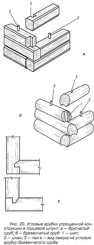 Самым простым и экономичным является соединение бревен в торцевой шпунт. Отличительной чертой этой технологии является то, что шип, сделанный в торцевой части одного бревна, входит в паз на боковой стороне другого бревна (рис. 20).