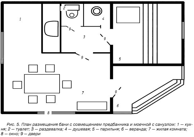 Вариант бани, приведенный на рисунке 5, представляет собой продолжение санузла дома.