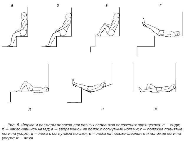 Следующей частью бани является парильня. Это важнейшее банное помещение должно быть таким, чтобы человек в нем чувствовал себя достаточно комфортно, его тело равномерно прогревалось, а также была возможность использовать веник. Размеры парильни принимаются в зависимости от того, сколько человек одновременно будут в ней мыться и в каком положении они будут располагаться на полке – сидя, полулежа или лежа, а также тип печи. Наименьшая ширина полка для сидения – 40 см, если сидеть на нем с поднятыми ногами, то – 90 см. Если на полке лежать с согнутыми ногами, то его длина должна равняться 150 см, если лежать с вытянутыми ногами, то – 180 см. Форма полка может быть самой различной – плоской, с упором для головы, в виде кресла-шезлонга (рис. 6).
