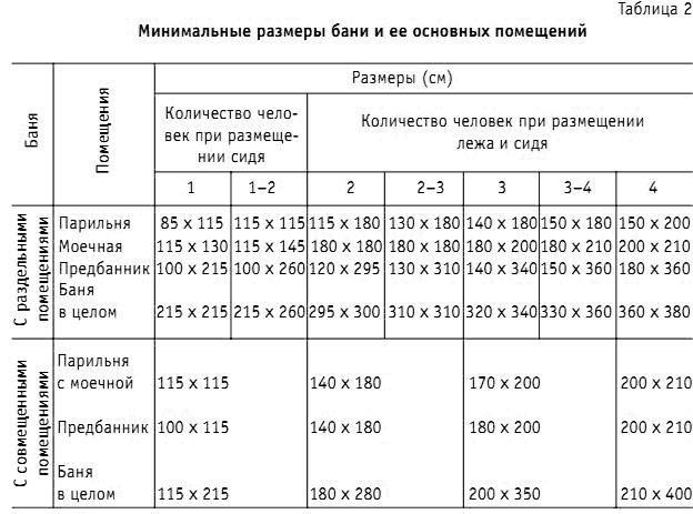 Минимальные размеры бани и помещений, предназначенных для мытья, указаны в таблице 2.