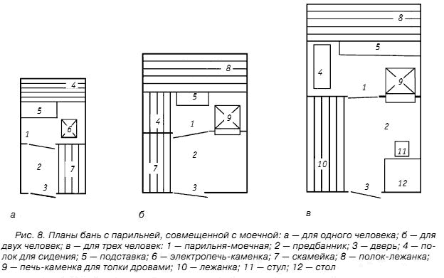 На рисунке 8 приведены конструкции бань, где парильня совмещена с моечной.