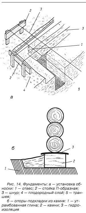 По углам площадки на расстоянии 1,0–1,5 м от внешнего контура бани следует вбить обноски – колышки с прибитыми к ним сверху брусочками (П-образные стойки), а между ними натянуть шнуры, которые и будут обозначать контур фундамента. После этого обязательно следует проверить правильность установки обноски, сверив расстояния между углами по диагоналям. Если стороны фундамента параллельны и углы между ними равны 90°, то диагонали будут равны между собой. Если грунт под будущей баней является достаточно однородным, то на него можно уложить крупные камни с параллельными плоскостями, а на них уже нижние венцы всей конструкции, предварительно обработав их антисептиком и обмазав горячим битумом или смолой (рис. 14).