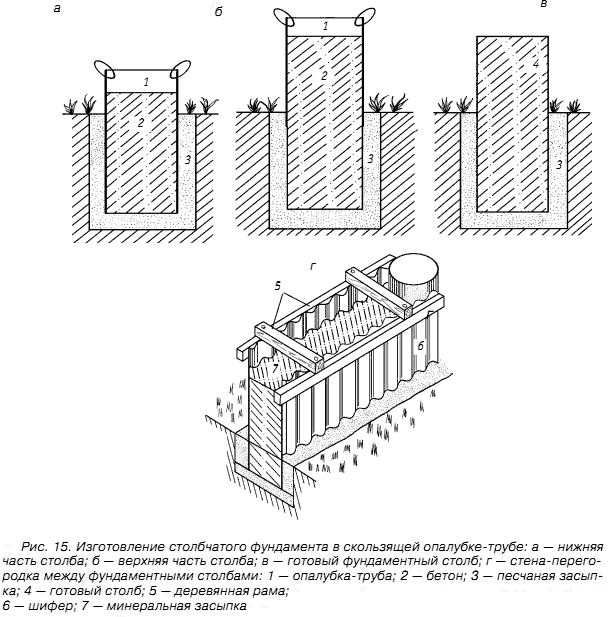 Пространство в яме или скважине, не вошедшее в опалубку, необходимо заполнить песком, который будет служить в зимнее время смазкой, не допускающей выталкивания столба из грунта. В опалубке разместить арматуру из толстой стальной проволоки или металлические стержни, связав их проволокой, после чего в трубу налить 2–3 ведра бетона и утрамбовать. Затем необходимо слегка покачать опалубку и поднять ее примерно на 30–40 см. Далее операция полностью повторяется: сначала снаружи засыпается песок, а потом внутренняя полость заполняется бетонной смесью. Получается, что опалубка просто скользит по скважине или яме, создавая столб требуемой высоты. Если применять этот способ, то один человек за час способен соорудить восемь таких столбов.