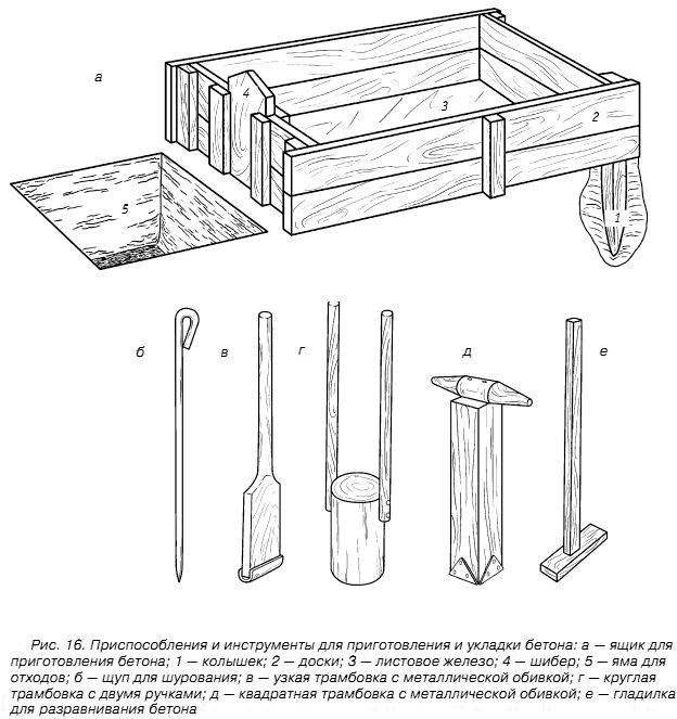 Бетонную смесь можно приготовить вручную. Делается это на листе железа или в ящике, днище которого обито железом (рис. 16).