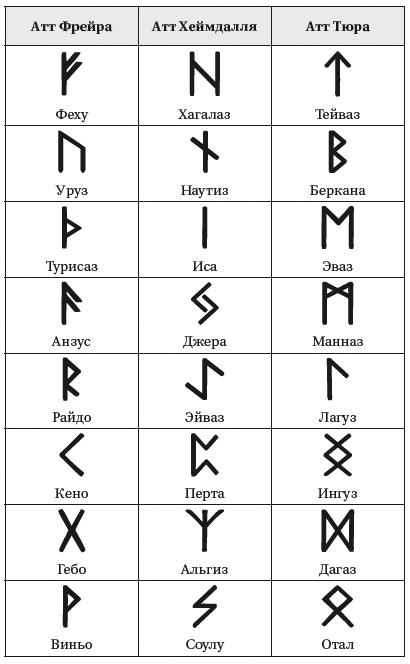 Атты – это восьмерки рун: с первой по восьмую, с девятой по шестнадцатую и с семнадцатой по двадцать четвертую. Каждая восьмерка рун – атт – соответствует одному из трех психотипов, соответствующих богам Северной традиции: Фрейру, Хеймдаллю и Тюру. У каждого человека ярко выражен один из этих трех психотипов, и он определяет то, как человек видит мир, мыслит, ощущает, реагирует на различные ситуации.