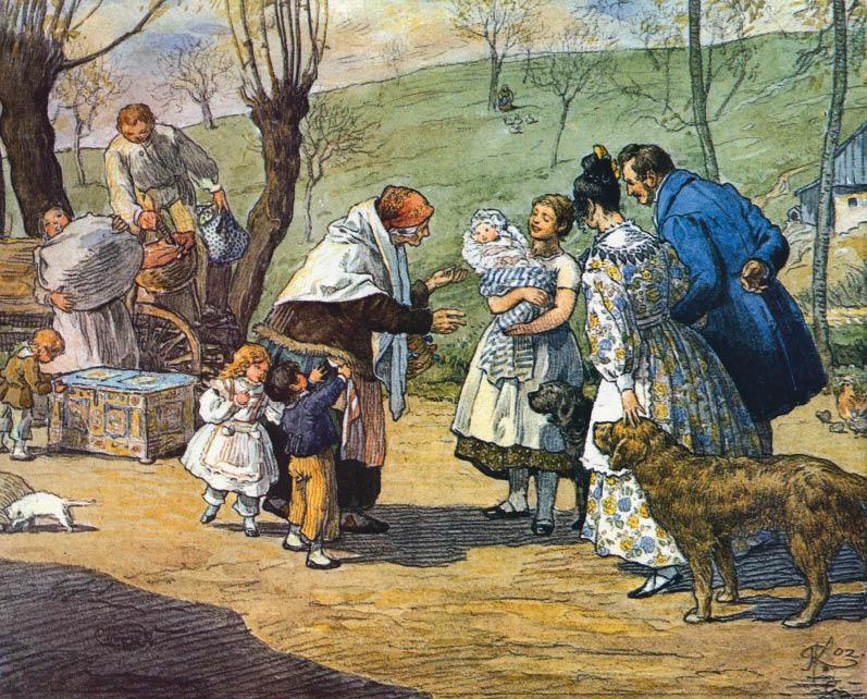 Хозяин пан Прошек, хозяйка, Бетка с младенцем на руках, дети и два огромных пса, Султан и Тирл, выбежали навстречу путешественнице.