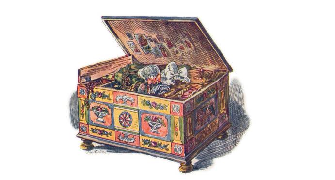 На самом дне сундука лежали бабушкино белье и одежда. Все эти юбки, фартуки, летние жакетики, корсажи и платки были аккуратнейшим образом сложены; сверху красовались два накрахмаленных чепца с пышными бантами на затылке. Детям ничего из этого трогать не дозволялось, но если бабушка была в хорошем расположении духа, то она сама по очереди вынимала одну вещь за другой, поясняя:
