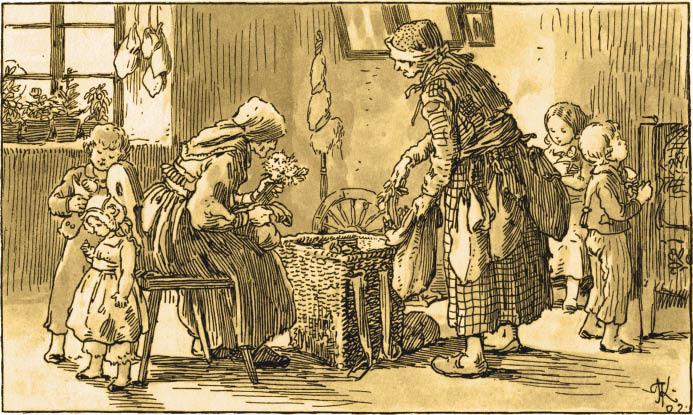 Но они потупились и так и стояли, пока мать не велела им подойти к бабушке, и только тогда подставили они ей для поцелуя свои розовые щечки. Дети просто опомниться не могли. Почему их бабушка совсем не такая, как те, которых они видели прежде? Такой бабушки им еще встречать не доводилось! Они не могли наглядеться на старушку. Обходили ее кругом, осматривали с ног до головы.
