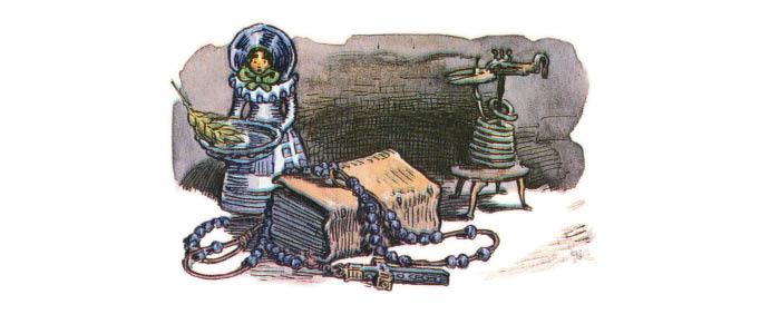 Комнатка эта была устроена по бабушкиному вкусу. У большой печи стояла скамья, вдоль стены — бабушкина кровать; рядышком с печкой, в ногах кровати, помещался расписной сундук, а у другой стены располагалась кроватка Барунки, которая ночевала у старушки. Посредине красовался липовый трехногий стол, а над ним свисала с потолка бумажная голубка — видимый образ Святого Духа. В углу у окошка стояла прялка; на пряслице была намотана кудель [5], из кудели торчало веретено; мотовило, служившее для наматывания пряжи, покачивалось на гвоздике. По стенам были развешаны картинки с изображениями святых; прямо над бабушкиной кроватью виднелось распятие, увитое цветами. Между рамами зеленели в горшках мускат и базилик, а на оконных откосах висели холщовые мешочки со всяческими кореньями, липовым и бузинным цветом, ромашкой и многим другим — это была бабушкина аптека. За дверью висела на крючке оловянная кропильница. В ящике маленького столика хранилось бабушкино шитье, томик божественных песнопений, молитвенник для особых случаев, моток запасных шнурков для прялки, «мелок волхвов», освященный в праздник Богоявления, и «громовая свеча», которую бабушка всегда зажигала во время грозы. На печке лежали кремень с кресалом и трут [6]. В комнатах огонь давно разжигали с помощью бутылочки с фосфором, но бабушка не хотела иметь с этой дьявольской штуковиной ничего общего. Правда, однажды она ею все-таки воспользовалась... и едва не задохнулась, да еще и прожгла фартук, который носила целых двадцать пять лет. С тех пор она к бутылочке не прикасалась. Старушка привыкла к кресалу, а тряпки для трута приносили ей внуки; они делали спички, окуная жгутики в серу. Детям это занятие очень нравилось, и они каждый день спрашивали бабушку, не нужны ли ей новые спички. Лишь удостоверившись, что ее зажигательное приспособление лежит на печке, бабушка могла со спокойным сердцем укладываться спать.