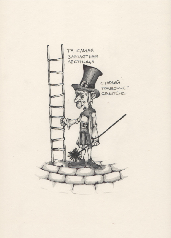 Дальше выше по улице навстречу шёл старый трубочист Сбытень. Худой и длинный, как кочерга, он нёс свою длиннющую лестницу. Лад был так увлечён своими мыслями о предстоящих подвигах, что поздно заметил старого трубочиста и налетел на его лестницу. Сбытень потерял равновесие, стал выписывать забавные кренделя ногами и, круто закрутившись, краем лестницы заехал в окно ближайшего дома. Оттуда послышался звон разбиваемой посуды и ругань жильца. Старый трубочист, растерянно оглядываясь, сердито прикрикнул на Малютку: